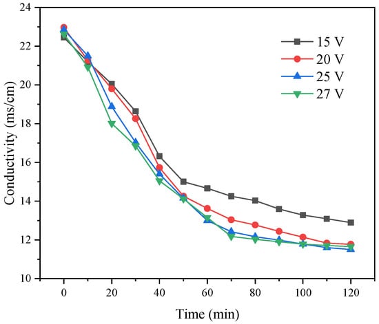 The concentrated NF water was placed into the ED desalination chamber, and the conductivity changed with time under the four constant applied voltages. As shown in Figure 15, the TDS of the desalination chamber decreased exponentially with time under different voltages. The main reason was that the solution in the desalination chamber was electrolytically separated under the action of voltage. When operating ED under the different applied voltages, we observed certain differences in the conductivity of the desalination chamber, with a high ion migration rate under a voltage of 25 V.