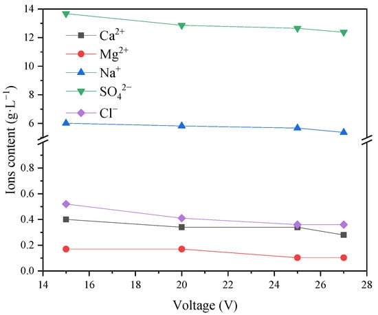 This showed that with an increase in voltage, the current increased. Due to the constant membrane area and current density, the transmembrane migration of ions in the desalination chamber to the concentrated chamber increased. Thus, the recovery rate of inorganic salts improved. At this time, most salts in the concentrated water were recovered. As shown in Figure 17, the chloride in the concentrated water was essentially removed, and the rest was basically sulfate. The reason for the analysis is that the properties of different ions are different, indicating that under different voltages, the removal rate of Cl− is faster than that of SO42−, and Cl− can be removed more effectively at the same time.