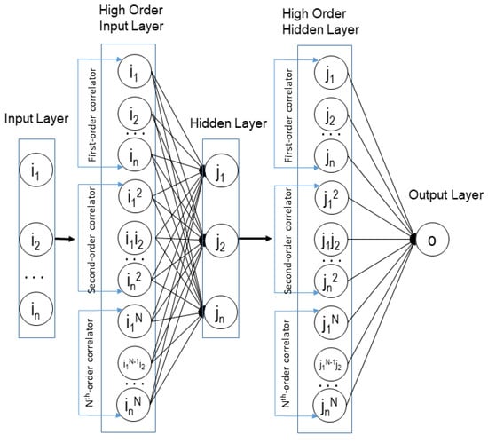 where y is the output of the neural network and is the activation function. Architecture-wise, as illustrated in Figure 1, HONN have interconnected layers, and the input vector will be calculated in each correlator (order) and then applied to the weighted sum of those.