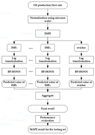In this research, a hybrid model of combining EMD and HONN with a backpropagation learning method is proposed to forecast the oil flow rate of 30 well production data. Another hybrid model of EMD and MLMVN is also introduced as a benchmark. The proposed method includes several steps, as shown in Figure 4. The first step is to deliver pre-processing of all datasets. The pre-processing started by normalizing all values to the same range. For the CB dataset, the scaler was applied as in the original paper, which calculated the ratio to maximum production (9500 m3) []. For the CS dataset, a min-max scaler (−1 to 1) is applied for HONN and 0 to 1 for MLMVN. Additionally, the normalized value is processed with an EMD algorithm which constructs multiple IMFs (and residue) for each dataset. Due to the fact that the proposed learning algorithms are not able to learn from time-series data directly, the feature transformation using a lag feature transforms to the supervised-learning dataset. For this research, two up to five prior time series data were selected as inputs (i.e., Xt−5, Xt−4, Xt−3, Xt−2, Xt−1, for the lag feature of five) and the subsequent time series as a target (y). Then, the transformed feature feeds into HONN with the backpropagation learning method. For HONN and EMD-HONN, we chose hyperparameter as follows: the network architecture is one hidden layer for the activation function of tanh-tanh, the initial learning rate is 0.001 and is adaptive to the error of each epoch; if the error decreases, the learning rate multiplies by 0.7 and 1.05 if the error increase. The iteration for backpropagation learning (epoch) is 600, and the momentum is 0.9. The experiment was repeated with different hidden neuron configurations from 2 to 10 and also with the polynomial synaptic operation of linear (LSO), quadratic (QSO) and cubical (CSO). The best-performed model was selected to compete with other benchmark models.