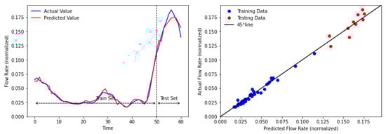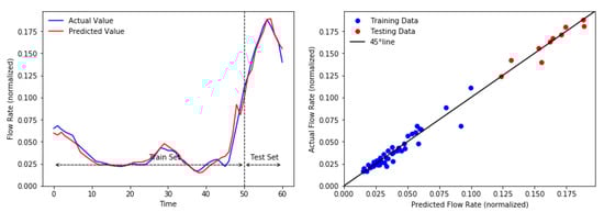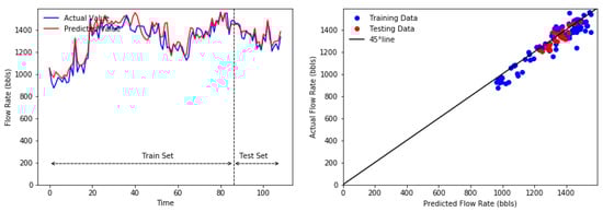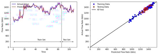 Commonly, well production rate is measured using a test separator for some minutes to hours and then applying certain calculations to represent the whole day production of the well. In more advanced technology, the rate is measured by multiphase flow meters (MPFMs) that are equipped with several sensors, such as an ultrasonic meter that is used for gas rate measurement and a capacitance meter that can measure very high water cut, which is barely possible to acquire using the conventional method [,]. In many oil fields, a production test is not acquired every day for each well due to the well number limitation of test stations to conduct the test. Therefore, conducting specific tasks such as well performance monitoring will rely on a lagged test that leads to late action when something occurs in the well. Hence, petroleum engineers have difficulty determining declining well production earlier. For a longer production span, some traditional approaches are common to forecast production, including decline curve analysis (DCA), exploration interpolation and the black oil model []. Since those forecasting models need to be tuned with proper parameters and pick the right slope, its main disadvantage is a subjective judgment by the expert who is conducting the analysis []. For shorter-term prediction, many approaches have been proposed using data-driven methodology, such as using thermogravimetric data to predict oil flow rate [], inferring flow rate from real-time parameters using diverse neural networks [] and many data mining methodologies. Another study involves additional hardware such as extended venturi and the use of a support vector machine (SVM) for the model []. Another experiment was augmented by a lab-scale vertical pipe to obtain differential pressure signals as the inputs to principal component analysis and neural network models [].