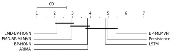 Using the Friedman chi-square test (using scipy python library) with MAPE metrics for all datasets, the results are as follows: statistic = 52.828 and p-value = 1.270 × 10−9. Seeing this result, the null hypothesis can be rejected. Then, to determine which methods are significantly different, the Nemenyi post hoc test was utilized, and the result is shown in Figure 9. The result shows that EMD-BP-HONN is significantly different from other benchmark methods except with EMD-BP-MLMVN. EMD-BP-MLMVN significantly differs from persistence and LSTM; however, it is not significantly different from ARIMA and BP-HONN.
