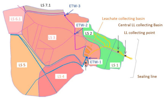 Landfill sections of Leppe landfill. LS: landfill section; ETW: extraction well [18].