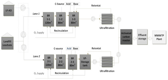 The bioreactors are arranged in two lanes based on a scheme of nitrification, denitrification, and nitrification. In addition, there is an ultrafiltration (UF) storage tank; in this study, the UF storage tank was used only for L-2 to avoid the possibility of mixing sludge from the two lanes. After biological treatment in the two lanes, the activated sludge is pumped to a UF unit. The purpose of the UF is to separate the treated leachate from the biomass and the decomposed content. The concentrate is returned to the bioreactors as retentate to maintain bacterial density in the biology. The sludge that is no longer needed for degradation is removed from the system in defined quantities. This sludge is commonly referred to as excess sludge or surplus sludge. The permeate from UF is then fed into five GAC filters. The activated carbon filters are used for the adsorptive retention of dissolved substances that are very difficult or impossible to biodegrade, such as inert COD compounds and AOX components [21]. The pretreated wastewater is then discharged to the Bickenbach municipal wastewater treatment plant in accordance with the requirements of Wastewater Ordinance [22].