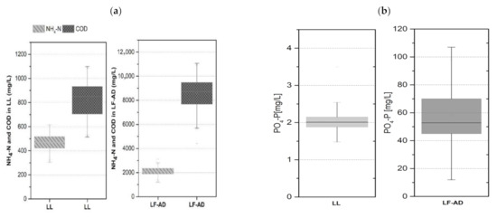 (a) Overview of NH4-N, COD, and (b) PO4-P concentrations in the LL and LF-AD over the course of the entire experiment.