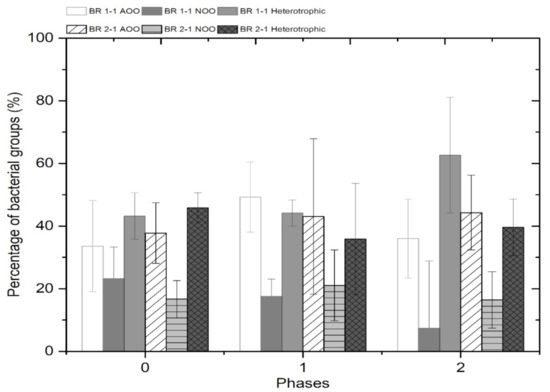 Furthermore, as illustrated in Figure 5, the proportions of all of functional metabolic groups remained nearly constant throughout all phases of lane 2. During the experiment, 36.03% AOO, 18.57% NOO, and 43.45% heterotrophic bacteria were found in L-2 on average. These values are nearly identical to those obtained in L-1 during Phase 0. In L-2, there was no dominance in terms of heterotrophic bacteria, but there was a slight reduction in the share of heterotrophic bacteria, and a corresponding increase in the NO3-N concentration in BR2-1 (Figure 4b) was noticed. Due to a high NH4-N load and the insufficient availability of biodegradable carbon sources for denitrification, the NO3-N concentration in L-2 might have increased. Ma et al. [46] demonstrated the domination of AOO and NOO over heterotrophs at low C/N ratios. Therefore, C/N imbalances should be corrected in a subsequent study by increasing the acetic acid dosage in L-2, so that a comparable C/N ratio can be maintained in both lanes and stable nitrification and denitrification can be achieved. Analysing the microbial communities of activated sludge samples collected at various stages of the experiment could provide more information on the impact of different C/N ratios on nitrifying and denitrifying organisms.