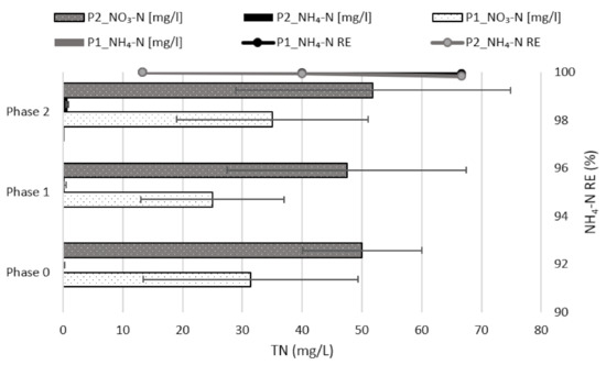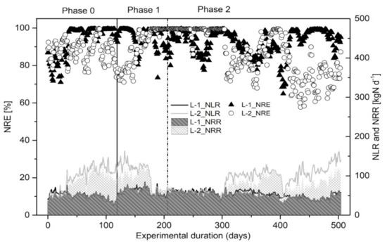 Nitrogen removal capacity: the LLTP was operated continuously and stably between temperatures of 23 to 35 °C without serious failures. The pH in the bioreactors was maintained between 6.9 and 7.8. The dissolved oxygen concentration in the nitrification reactors was maintained between 3 and 5 mg/L. Figure 6 represents the variations in the nitrogen loading rate (NLR), nitrogen removal rate (NRR), and NRE of the LLTP with respect to the activated sludge process over 500 days. In L-1, an average NRE of 93.4%, 95%, and 92% was observed in Phases 0, 1, and 2, respectively. The NRE in L-2 was found to be 88%, 90%, and 86.1% in the respective phases. No literature data were found on the co-treatment of the LF-AD and LL in an industrial-scale LLTP with nitrification, denitrification, and nitrification processes. However, several studies have focused solely on the biological treatment of the LF-AD on a laboratory scale, e.g., Chuda and Ziemiski [31] used the activated sludge method with a separate denitrification chamber for the treatment of the LF-AD and achieved an NRE of 83.73%. Dosta et al. [37] achieved an NRE of nearly 100% in a lab scale sequencing batch reactor when treating centrifuged reject water from a wastewater treatment plant’s anaerobic digester. Obaja et al. [36] processed liquid fractions of digested piggery effluent in a lab size sequencing batch reactor packed with activated sludge and achieved NH4–N removal rates of 99.7%. An NH4–N removal efficiency of 99.9% in phase 1 and 99.8% in phase 2 was achieved in the current study using an activated sludge process and UF treatment during the co-treatment of the LF-AD and LL (Figure 7). The concentration of NH4–N in the permeate of L-2 (P2) after UF was also nearly zero throughout the investigation, with an NH4–N removal efficiency of 99.9%. The results of the lab scale research suggest that a conventional activated sludge system could be used to treat the LF-AD. This study shows that the LF-AD can also be co-treated with LL in an industrial-scale LLTP with different volume ratios. Chiumenti et al. [14] attempted to treat the LF-AD using a full scale physical separation process that included liquid/solid separation, centrifugation, UF, and reverse osmosis processes but were unable to meet the criteria limit imposed by the Water Framework Directive and Urban Wastewater Treatment Regulations for surface-water discharge (NH4-N = 25 mg/L, limit 15 mg/L). The full-scale physical separation process required approximately 25 kWh/m3 [44] of energy consumption. As previously stated, the treatment and maintenance costs for physical treatment processes are significantly higher than those for activated sludge treatment [15]. The feasibility of commercial membrane filtration is influenced by the capital cost of the equipment, the membrane lifespan replacement cost, and cleaning operations [14]. On the other hand, the autotrophic nitrogen removal process, which is based on the coupling of two biological processes, partial nitritation (PN), and anammox (A), was used in a study [9] for the treatment of the LF-AD diluted with water (50% and 30%) and demonstrated an acceptable NRR. However, its application was hampered by the high salinity and inhibitory potential of the digestate. Anammox bacteria are highly sensitive to environmental changes and have a low cell yield of 10–14 d at 30–40 °C; the complexity of the LF-AD and other industrial WW compositions makes the anammox process more difficult to initiate [47]. Therefore, treating the LF-AD in an LLTP where the activated sludge is already adapted to the high salinity of leachate may be advantageous.