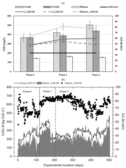 Chemical oxygen demand removal capacity: During the treatment of industrial wastewaters with high COD, the most successful and cost-effective technique to obtain the desired result is to remove organic materials using an activated sludge process. However, due to the complex composition of LL and the LF-AD, considerable volumes of organic matter remain in the effluent discharged following these biological treatments, making regulatory compliance problematic. As a result, an additional treatment step, such as activated carbon filtration, is required [49]. Organic matter, nutrients, micropollutants, and AOX components in the LL and LF-AD are typically too much for wastewater treatment plants with conventional activated sludge systems to handle [16]. Industrial wastewater can impair plant efficiency by interfering with biological functions, especially when wastewater treatment plants were not designed to handle specific types of industrial effluent and/or when the characteristics of industrial effluents alter over time. Toxicity, a higher nutrient content, and a larger concentration of organic waste can all cause changes in terms of microbial balance during the treatment process [50]. A membrane bioreactor system with a UF unit in combination with a GAC filter was used in this study to overcome the barriers of conventional wastewater treatment plants. Figure 8a shows the overall COD-RE (COD removal efficiency) in L-1 and L-2 after the activated sludge process and in the effluent after GAC treatment. It also shows the average COD concentration in the permeate of L-1 and L-2 after UF treatment and in the effluent after GAC treatment. L-1, which was used to treat the LF-AD, showed a COD-RE of 48%, 58%, and 60% in Phases 0, 1, and 2, respectively, after the activated sludge and UF processes, while L-2 showed a COD-RE of 47%, 54%, and 51%, respectively. After the UF process, the permeate from both lanes were combined and filtered using activated carbon filters. After activated carbon treatment, a COD-RE of 63.5%, 81%, and 78% was noticed in Phases 0, 1, and 2, respectively. Rico et. al. [51] investigated the treatment of the liquid fraction of dairy manure in a lab scale upflow anaerobic sludge blanket reactor and found that the COD removal efficiency was 70% with a HRT of less than 1 day and 80% with a HRT greater than 1 and 2 days. Gao et al. [52] used an integrated system of activated sludge, ozonation and activated carbon filtration to treat LL and achieved a COD-RE of 82.6%. Światczak et al. [13] evaluated the treatment of liquid phase digestate from an agricultural biogas plant mixed with municipal wastewater in a lab size SBR reactor with aerobic granules and UF system, which resulted in a COD-RE of 88%. The COD-REs from these several lab scale studies using different treatment methods for LL and the LF-AD (treated separately) were almost identical to the COD-REs from phases 1 and 2 of this industrial-scale study featuring the combined treatment of LL and the LF-AD.