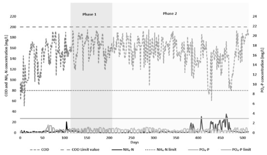 By treating the LF-AD in an LLTP, reduced volumes of LL during the aftercare periods can be substituted in the future. Pollutant concentrations in leachate not only vary over different phases at a landfill (e.g., acidic, methanogenic) but also over different seasons. However, for pre-treated wastes, changes in both the amount and consistency of leachate are mainly influenced by seasonal variations rather than by the landfill phase, as the pre-treated wastes have already undergone stabilization reactions during pre-treatment [54]. To certain extent, the co-treatment strategy can compensate for volume losses and lower leachate concentrations caused by seasonal variations and different phases of landfill, respectively. The LL quality typically indicates a nutrient imbalance; concentrations of organic matter, ammonium nitrogen, and heavy metals are high, but phosphorus levels are very low. The challenge of the effective biological treatment of leachate is exacerbated by the low phosphorus content and the presence of concentrated heavy metals [49]. The increased phosphorus load from the LF-AD during Phase-2 has advantages and partially stabilizes its susceptibility to nitrification. The PO4-P concentration in the effluent of the LLTP was below 2 mg/L throughout the study (Figure 9). The PO4-P content in the LF-AD (Figure 3) was also retained and utilized during the biological treatment stage. A positive effect of the high phosphorus load in the LF-AD was the partial saving of the phosphoric acid dose in the LLTP. The long-term goal of the LLTP is to investigate the 20% volumetric flow (i.e., 80% v/v NH4-N load) of the LF-AD in the current project. Higher volumes of the LF-AD also mean higher COD loads and higher stress on the activated carbon filters, which in turn leads to a shorter plant life and higher costs. Thus, the proper monitoring of COD loads and gradual adaptation phases are necessary when treating the LF-AD in an LLTP.
