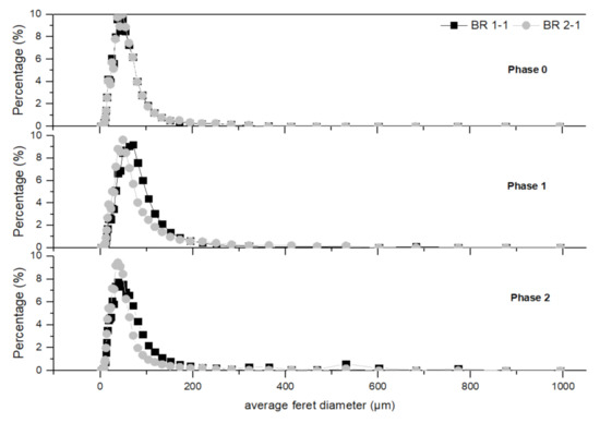 To investigate the influence of particles in the LF-AD and landfill leachate on activated sludge flocs, the particle size distribution of the biomass in the first nitrification reactors of both lanes was studied. Monitoring the changes in particle size of the activated sludge helps in the timely detection of biomass changes that may lead to the clogging of the UF system. Figure 10 shows the average Feret diameter of the activated sludge particles in the bioreactors during Phases 0, 1, and 2.