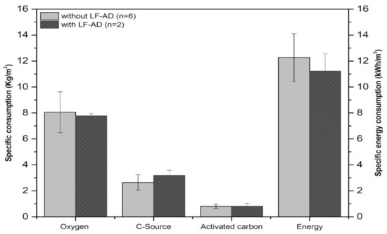 During co-treatment and conventional LL treatment, the operational resources required for the treatment and the performance efficiency of the LLTP were assessed. The specific operational resources, i.e., the energy required, the external carbon, the activated carbon, and the oxygen of the LLTP were calculated using data from six years of conventional LL treatment and two years of combination treatment.
