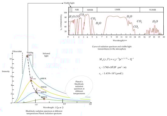 where and are the Planck first and second constant, respectively, and is the radiation rate. The Planck radiation spectrum is shown in Figure 1. From Figure 1 we can see that the radiance of the blackbody increases with the increasing temperature; the radiance at the same temperature is continuous and reaches a peak. As the wavelength increases, the radiance increases first and then decreases [30,31].
