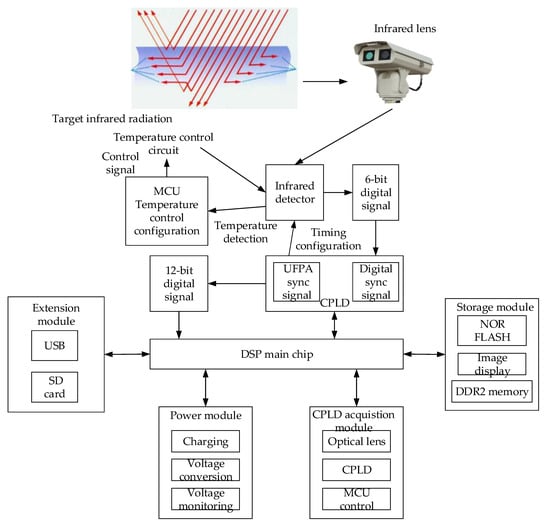 After the imaging system is turned on, the power supply circuit allocates three different voltages to each circuit, so that each chip can complete the startup. When the CPLD program is running, the drive timing configuration and register configuration information are transmitted to the infrared detector, and the infrared detector completes the startup. At the same time, the infrared radiation light of the object is transmitted through the air, and the optical system allows the radiation of 8.0~14.0 μm bands to pass through and absorbs or reflects the radiation from other bands [37,38]. When the infrared light is transmitted to the entire infrared focal plane and reaches the integration time, the array-induced radiation energy is converted to a 6-bit electrical signal by using a readout circuit and transmitted back to the 12-bit electrical signal synthesized by the CPLD. The front-end interface VPFE (video processing front end) of the VPSS (video processing submodule) of the DSP master chip receives the integrated 12-bit digital signal. The DSP processes the video signal with nonuniformity correction and pseudo-color mapping, stores the processed signal loop in memory, and finally the output thermal images are shown on the LCD (liquid crystal display) display or a PC (personal computer). The overall diagram of the uncooled imaging system is shown in Figure 2.