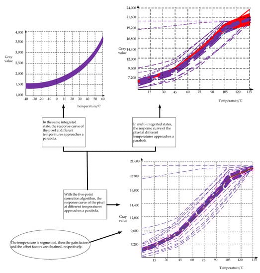 The maximum obtained in Equation (8) served as the correction value of this interval; based on the two-point correction principle, the gain and offset lineage arrays were generated at calibration point , and the latter four points were processed in the same way, so that 384 × 288 × 5 sets of gain and offset coefficients were obtained. As shown in Equations (9) and (10)