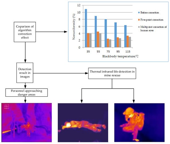 The experimental results of sending a warning when the personnel approached dangerous areas via noncontact detection in coal mines and sending an emergency rescue are shown in Figure 4. We can see that the nonuniformity of the image is effectively corrected, reducing the influence of the interference noise, and the target can be clearly seen. After collecting and comparing the nonuniformity values conducted at different blackbody temperature intervals using the five-point correction algorithm and the multipoint correction algorithm of human eyes, respectively, it shows that when the blackbody temperature reaches 115 °C, the nonuniformity is 6.32% before the multipoint correction of human eyes, and 2.99% after it. It is not difficult to see that the multipoint correction algorithm based on human eyes proposed in this paper has good denoising ability, improves the detection accuracy of the algorithm, and reduces the data processing amount, calculation and workload of the processor CPU, so as to effectively improve the detection speed of the algorithm.