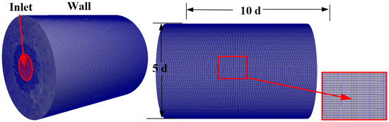 Figure 1 shows the major computational system with the relevant boundary conditions expected in the present calculation. The simulations focus on the region downstream of a 0.2 mm diameter nozzle that releases a fully developed turbulent liquid flow into a dense, initially stationary gas. Boundary conditions include the pressure condition (atmosphere), no-slip wall condition (wall), and mass flow condition (inlet). The flow conditions are listed in Table 1 according to the experiment conducted by Blessing et al. [46]. The liquid is diesel fuel, and the gas is air at a pressure and temperature of approximately 1 bar, as summarized in Table 1. The inlet velocity distribution was set to a parabolic profile with the decrease in radial distance to the central point, and the maximum value Umax = 336 m/s occurs at the central point of the inlet boundary face.