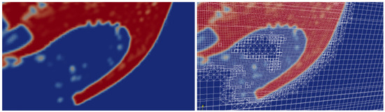 The example of adaptive mesh refinement is shown in Figure 2. The maxRefinement parameter determines the maximum number of times that a cell can be cut. In this study, with maxRefinement 2, a hexahedral type of cell can be cut at most twice, thus giving rise to 23 × 23 (64 cells). The maxCells parameter limits the maximum number of cells in the model.