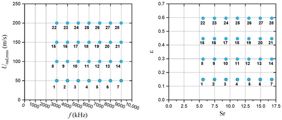 For the flow conditions in this study, the maximum radial velocity is about 50 m/s. An overview of the simulation cases performed is shown in Figure 4. Twenty-eight cases were calculated to study the primary breakup of disturbed liquid jet sprays. The simulations cover a wide range of disturbance amplitudes and frequencies. The disturbance amplitude varies from 50 m/s to 200 m/s, whereas the disturbance frequency varies from 3000 kHz to 9000 kHz. The Strouhal number (Sr) and the nondimensional disturbance amplitude ε are calculated based on Equations (12) and (13) [21].