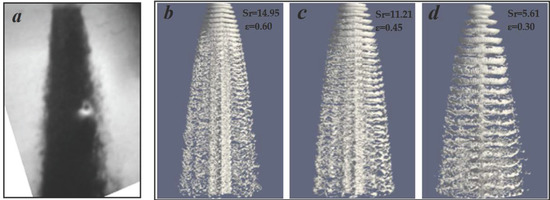 Shape of sprays obtained by Blessing et al. [46] and the simulation results. (a) Experimental image. Injection pressure Pinj = 80 MPa, i.e., injection spray velocity Uinj,l ≈ 336 m/s, ambient air pressure and temperature Pg = 0.1 MPa and Tg = 298.15 K, nozzle diameter D = 0.2 mm [46]; (b) Sr = 14.95, ε = 0.60; (c) Sr = 11.21, ε = 0.45; (d) Sr = 5.61, ε = 0.30.