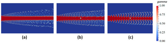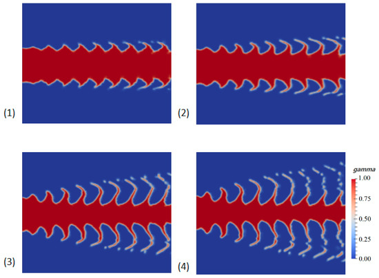 A detailed view of the liquid–gas interface is shown in Figure 7. Surface waves are generated from the nozzle exit. Moving towards the downstream direction, the amplitude increases, and the surface waves break up into droplets. The wavelength of the surface wave becomes small with the increase in the disturbance frequency, and this phenomenon results in a difference in the droplet distribution. Figure 8 shows the distribution plot of the droplet size for the three cases. Droplet formation from wave sheets is observed. As the disturbance frequency increases, the wavelength and thickness of the wave sheet decrease, and the wave easily breaks up into droplets. The quantity of droplets increases, whereas the droplet size decreases with the increase in the disturbance frequency.