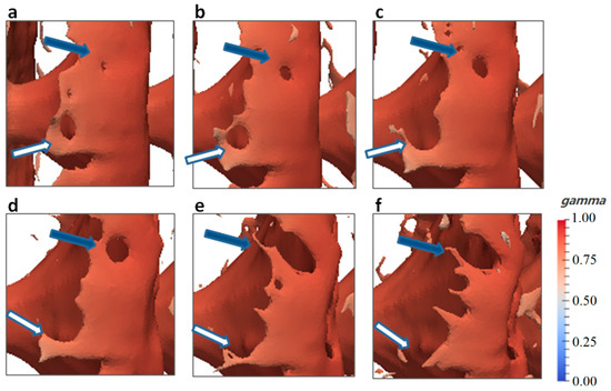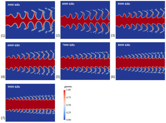 The simulation results of the liquid volume fraction for the conditions f = 3000 kHz to 9000 kHz and ε = 0.45 are presented in Figure 12. The sinusoidal radial velocity at the nozzle exit creates surface waves along the axis of the liquid jet. As the perturbation of surface waves grows along the flow direction, the thickness of the radial liquid sheet decreases as it is sheared, and surface tension breaks up the liquid sheet into ligaments. This process is called primary breakup. After primary breakup, ligaments may break up into small droplets, and this process is called secondary breakup. In this section, the characteristics of the surface wave and primary breakup are analyzed.