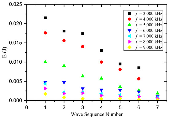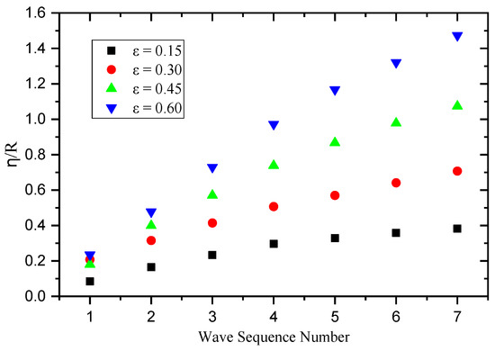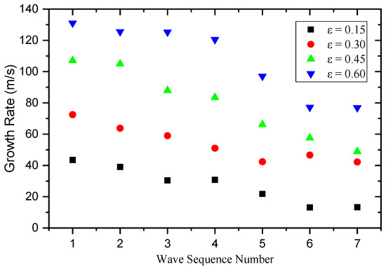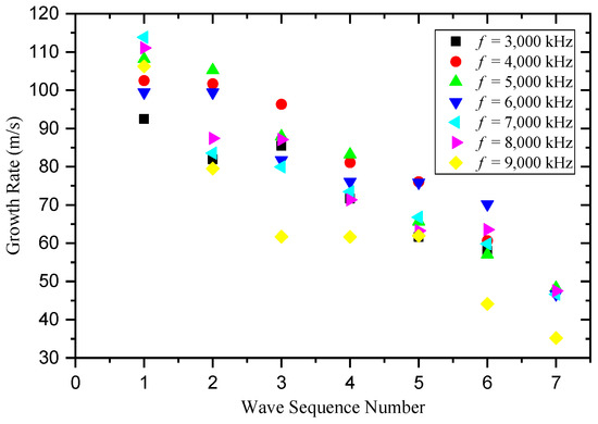 To analyze the development of surface waves along the axis of the liquid jet, surface wave structures along the direction of jet development are counted and analyzed. The wave sequence number increases in degrees. Figure 13 shows the dimensionless amplitudes, η/R, of the surface waves corresponding to the different surface wave sequences at a disturbance amplitude of ε = 0.45 and the disturbance frequencies ranging from f = 3000 kHz to 9000 kHz. The surface wave sequence number closest to the nozzle exit is set to 1, and then the sequence number gradually increases along the downstream direction. For the seven disturbance frequencies, the amplitude of the surface waves increases nonlinearly along the flow direction. At the same surface wave amplitude, the higher the perturbation frequency the higher the number of surface waves. This indicates that increasing the perturbation frequency reduces the surface wave wavelength, which will facilitate the reduction of the droplet size. Figure 14 shows that the growth rate of the surface wave amplitude decreases with an increase in distance from the nozzle exit. The decay of the growth rate should be related to the viscous dissipation of the fluid.
