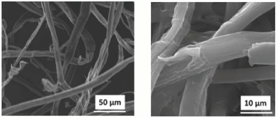 Micro- and nano-cellulose materials can be extracted by chemical and mechanical methods. Cellulose microfibers (CMFs) with diameters of 10 µm and several micrometers in length have been obtained using chemical, mechanical, or a combination of both processes [9,10,11]. Acid hydrolysis breaks the glycosidic bonds of the crystalline regions and amorphous regions of cellulose [12,13]. This can be achieved by using a variety of organic and mineral acids, including sulfuric acid [11], hydrochloric acid, phosphoric acid [14], hydrobromic acid, or mixtures of different acids [15]. Cellulose nanofibers (CNFs), on the other hand, have been extracted using mechanical treatment, ultrasonic treatment, cryo-crushing, and high-pressure homogenization to produce fibers of diameters ranging from 10–100 nm and lengths up to several microns [16]. However, for some applications, including water treatment, there is evidence suggesting that it may not be necessary to process cellulose all the way to the nanoscale. Chen et al. [17] calculated a maximum adsorption of As(III) as 344.82 and 357.14 mg g−1, for nanofibrillated and microfibrillated cellulose, respectively. Periodate oxidation resulted in functionalization of a large surface area within the fibers, providing high surface areas for adsorption.