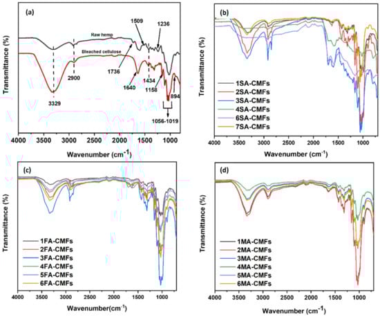 FTIR spectra of (a) raw hemp fiber and bleached cellulose, (b) Sulfuric acid hydrolyzed CMFs, (c) Formic acid hydrolyzed CMFs, and (d) Maleic acid hydrolyzed CMFs.