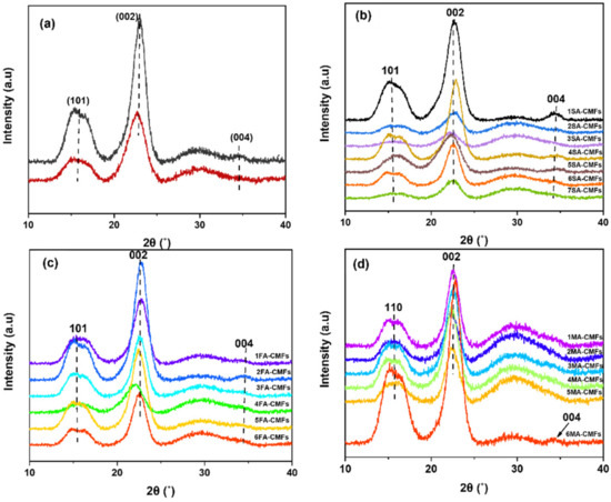 XRD spectra of (a) fibers (raw hemp fiber-red and bleached cellulose fiber-black), (b) sulfuric acid hydrolyzed CMFs, (c) Formic acid hydrolyzed CMFs, and (d) Maleic acid hydrolyzed CMFs produced from hemp fibers.