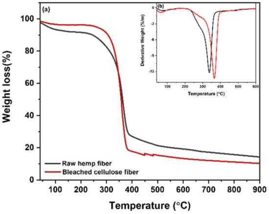 The thermal degradation of raw hemp fiber began at 207 °C while that of bleached cellulose fiber began at 232 °C. This upward shift can be attributed to the absence of lignin in pre-treated cellulose [54]. After chemical treatment, the weight loss (%) increased from 72% (raw hemp fiber) to 82% (bleached cellulose fiber) and ash residue amount at 900 °C was 14% and 10% for raw hemp fiber and bleached cellulose fiber, respectively. This suggests that the thermal stability of bleached cellulose fiber is greater than that of raw hemp fiber. Similar thermal decomposition profiles were reported for pineapple leaf nanocellulose (Tonset at 215 °C) and raw pineapple fiber (Tonset at 230 °C) [43].