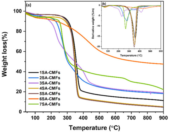 As shown in Figure 7a,b, the thermal stability of sulfuric acid hydrolyzed CMFs followed the order: 1SA-CMFs < 4SA-CMFs < 5SA-CMFs < 7SA-CMFs < 6SA-CMFs < 2SA-CMFs < 3SA-CMFs. The highest thermal stability was found in 1SA-CMFs with an onset decomposition temperature of 268 °C and maximum decomposition temperature of 387 °C. High thermal stability of CMFs can be attributed to the removal of amorphous regions of cellulose, e.g., hemicellulose, lignin and other non-cellulose content after hydrolysis and the homogenizing treatment of cellulose samples [16,60]. Sulfuric acid extracted CMFs, however, e.g., 3SA-CMFs had a reduced thermal stability and a lower Tonset at 152 °C. Two mechanisms can be considered to contribute to this phenomenon; the first is that sulfuric acid already leads to greater depolymerization of the cellulose chains and the shorter cellulose chains are more easily degraded [51,61]. Secondly, the presence of sulphate half ester groups leads to the generation of sulfuric acid in the initial dehydration step. This stronger acid catalyzes greater cellulose dehydration than the weaker carboxylic acid (generated from the dehydration of maleic and formic acid treated cellulose).