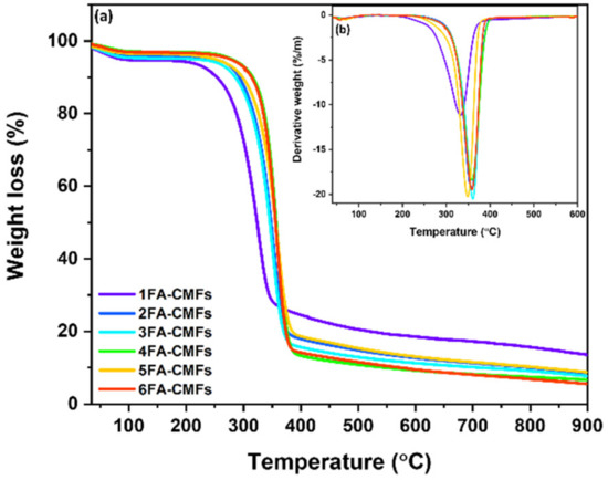The thermal stability of CMFs extracted using formic acid was in the following descending order: 6FA-CMFs > 3FA-CMFs > 2FA-CMFs > 4FA-CMFs > 5FA-CMFs > 1FA-CMFs as seen in Figure 8a,b. Both the Tonset and Tmax of 6FA-CMFs were determined to be higher than the Tonset and Tmax of 1FA-CMFs (see Table 2). High thermal stability can be attributed to the removal of disordered regions of cellulose and hemicellulose during hydrolysis, whereas low thermal stability can be attributed to insufficient hydrolysis by weaker formic acid [51,62]. This is also in line with the relatively low crystallinity index of 1FA-CMFs showed on the XRD spectra and the high ash residue of 28% at maximum temperature 900 °C.