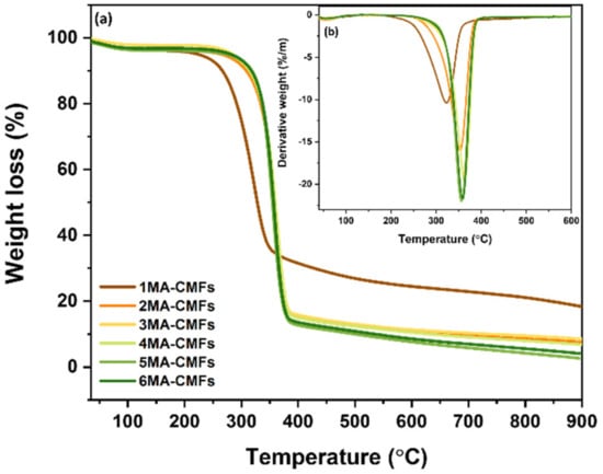 Figure 9a,b, show the TG and DTG curves of maleic acid hydrolyzed microfibers. The data show that 1MA-CMFs had the lowest initial degradation temperature (203 °C) while 6MA-CMFs had the highest (265 °C). Furthermore, 1MA-CMFs had a lower crystallinity and higher ash residue than 6MA-CMFs. The lower acid concentration and lower temperature in 1MA-CMFs likely resulted in less hemicellulose removal, leading to lower thermal stability and crystallinity [63,64]. Seemingly, the thermal behavior of the materials is related to their crystallinity.