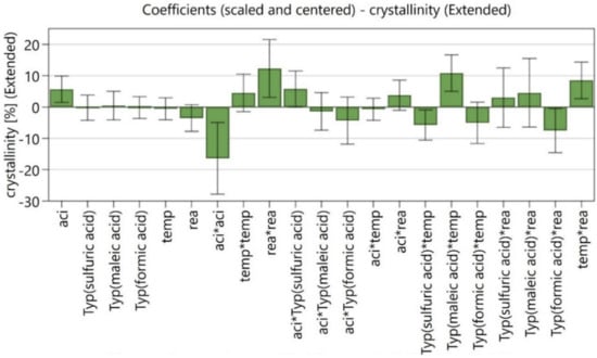 All three factors investigated had a significant effect on the crystallinity of the CMFs (p-value < 0.05). A positive regression coefficient indicates a direct proportionality effect to crystallinity, whereas a negative coefficient value indicates the effect of an inverse relationship with crystallinity [66]. From Figure 10, it is illustrated that the linear factors (various types of acids and temperature) show that there is both a positive and negative correlation with the crystallinity, whereas other linear factors, acid concentration, and reaction time show positive and negative effects, respectively.