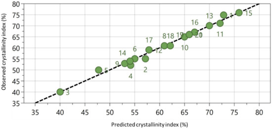 Plot of observed vs. predicted crystallinity indexes (%) in the regression model.