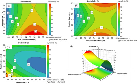 Response contour plots as well as surface plot analysis (Figure 12, Figure 13 and Figure 14) were used to describe the relationship between varying factors within the experimental range, while one factor was kept constant at the center point. The shapes of the contour plots indicate the nature and scope of the interactions. Circular plots describe insignificant interaction between two variables, whereas non-circular (elliptical) plots represent a significant interaction [69]. The response contour plot for sulfuric acid (Figure 12) suggest that for microfibers produced using sulfuric acid, the degree of crystallinity was high when hemp cellulose was exposed to an acid concentration range of 51–65%, and temperature of about ~50 °C for 60 min (Figure 12a). In general, crystallinity seemed to be maximized when acid concentration was higher than 52% regardless of the reaction time (Figure 12b), and by manipulation of reaction time and hydrolysis temperature (Figure 12c), at low reaction time and low temperature, the crystallinity degree increased. Figure 12d shows the surface plots of sulfuric acid hydrolysis and confirmed the same trend shown in the contour plots that an increase in crystallinity is influenced by an increase in acid concentration to a certain degree even at low temperatures. Furthermore, from the results obtained, the crystallinity degree decreases when high sulfuric acid concentrations are adopted, and this can be attributed to complete hydrolysis of cellulose to soluble sugars and other by-products [25]. Song et al. [70], reported that excessive treatment using H2SO4 either in higher concentration or longer treatment conditions NCC yield percentage did not improve but rather NCC would be degraded into other products. The contour plots show non-circular lines, and this can be attributed to a significant interaction between variables.