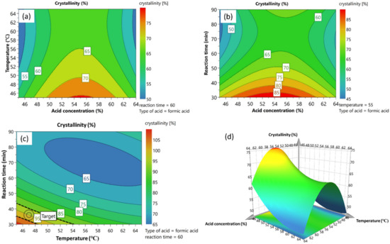 In accordance with the contour plots results, Figure 13a–c shows non-circular contour lines representing a significant interaction between the formic acid concentration and hydrolysis temperature, acid concentration and reaction time, and reaction time and hydrolysis temperature. From the surface plot (Figure 13d), higher crystallinity was observed with an increase in formic acid concentration in the range of 50–62% and at lower temperatures as also shown by the contour plot (Figure 13a).