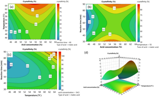 In the contour plots (Figure 14a–c), the relationships between maleic acid concentration and hydrolysis temperature, maleic acid concentration and reaction time, and reaction time and hydrolysis temperature are presented. The results show a non-circular nature of the plots, and this can be attributed to significant interaction between two variables. From Figure 14a, the crystallinity is highly influenced by an increase in temperature and an increase in acid concentration. The reaction time and hydrolysis temperature contour plot shows that the crystallinity degree is highly influenced by extreme hydrolysis conditions (temperature and time). Figure 14d, shows the surface plot relationship to crystallinity and an increase in crystallinity degree was observed at low temperatures and a maleic acid concentration range of 50–61%.