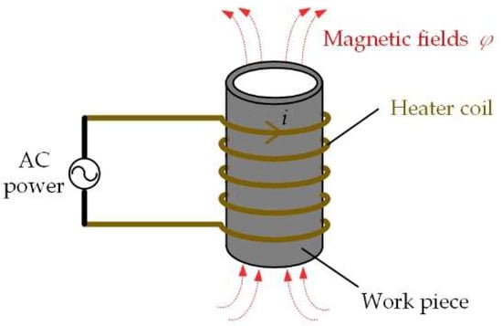 Figure 1 shows a diagram illustrating the principle of induction heating. Induction heating is a technology that uses electromagnetic induction to heat metals. According to Faraday’s law of electromagnetic induction, as shown in Figure 1, when current i passes through the heating coil, a magnetic field φ will be generated around it, and the eddy current produces the effect of Joule heating, which increases the temperature of the workpiece [23]. According to Joule’s law, the heat generated by the eddy current is determined as follows: