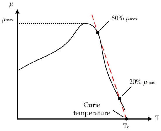 Figure 3 shows a schematic diagram of the Curie temperature. The Curie temperature can be represented by the symbol Tc, whose definition is shown in Figure 3. The Curie temperature is the intersection of the two-point line (80% μmax and 20% μmax points) extending to the temperature axis [24]. If the temperature of the workpiece reaches Tc, the ferromagnetism of the workpiece changes into paramagnetism, which means the magnetism disappears.