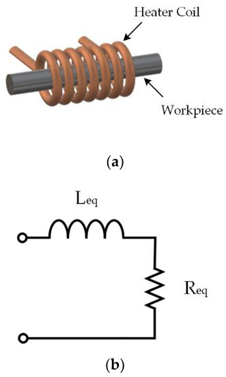 The load of the induction heating system includes the heating coil and the processing workpiece, as shown in Figure 4a, which can be equivalent to an inductive load, as shown in Figure 4b, which consists of a resistance Req and the inductance Leq [26,27].