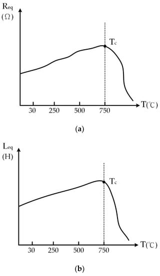 The equivalent inductance of the workpiece increases with the increase in temperature while heating [28]. When the temperature of the heating workpiece exceeds the Curie temperature Tc, the ferromagnetism of the workpiece disappears and converts into paramagnetism. The phenomenon causes the variation trend of the equivalent resistance and inductance value with temperature variation, as shown in Figure 5. Figure 5a is a schematic diagram of the variation trend of equivalent resistance with temperature. Figure 5b is a schematic diagram of the variation trend of equivalent inductance with temperature. In conclusion, it is necessary to note the influence of temperature on the parameters of the induction load while designing the induction heating system.