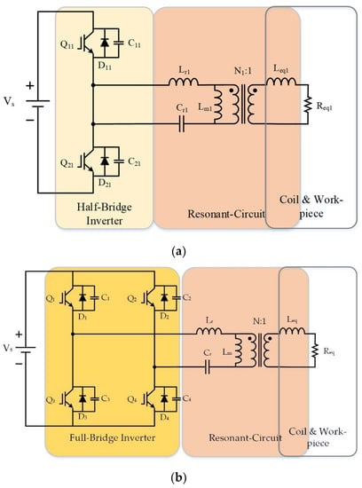 Figure 6 shows the circuit architecture diagram of the LC series resonant converter proposed in this study, where Figure 6a,b is based on the half-bridge converter and the full-bridge converter, respectively. This study focuses on the full-bridge LC series resonant converter because the full-bridge topology is more suitable for high-power occasions [29]. In addition, the induction load of the heating system, which is the heating coil and the workpiece, can be equivalent to an inductance Leq and a resistance Req. The commonly known equivalent model for the transformer includes a magnetizing inductance Lm and a leakage inductance Lk. Since the Lm of the step-down transformer is much larger than the leakage inductance Lk and the equivalent inductance Leq of the heating coil, Lm does not participate in the resonance. To simplify the proposed structure, this study ignores the effects of Lm and combines the external inductance Lr1 and the leakage inductance Lk into Lr, which considers their effects simultaneously.