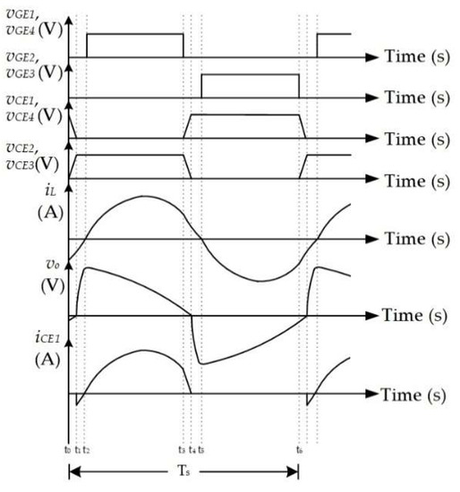 This study analyzes the proposed full-bridge LC series resonant converter under the steady-state condition. The fundamental waveforms and the operation modes can be obtained in Figure 7 and Figure 8, respectively. The operation modes are divided into six intervals, which describe the timing relationship between the IGBTs’ control signal vGE1(vGE4), vGE2(vGE3); the voltage across the IGBTs vCE1(vCE4), vCE2(vCE3); the current of the resonant inductor iL; the voltage across the heating coil vo; and the turn-on current of the IGBTs iCE1. Since the first three operation modes (t0–t3) and the last three operation modes (t3–t6) are symmetrical, the following only displays the operation and the equivalent models of the first three operation modes (t0–t3).