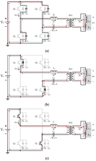 Operation modes of the full-bridge LC series resonant converter: (a) Interval I (t0−t1), (b) Interval II (t1−t2), and (c) Interval III (t2−t3).