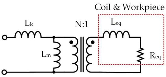 The parameters of the heating coil and the workpiece to be heated should be taken into consideration in the transfer function analysis. As shown in Figure 9, the equivalent model considers the transformer, the heating coil, and the processing workpiece, including the transformer magnetizing inductance Lm, the leakage inductance Lk, and the Leq and Req of the heating coil and the processed object. After the parameters on the secondary side are equivalent to the primary side, the equivalent model is modified, as shown in Figure 10.