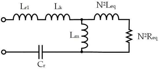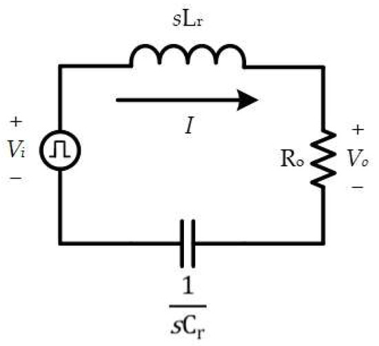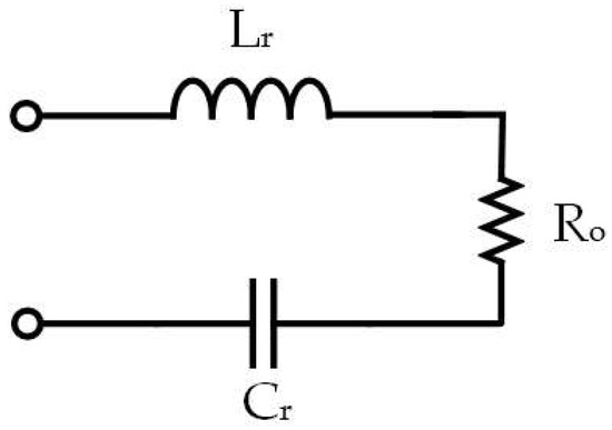 The value of Lm in the proposed architecture is about 1.3 mH, which is much larger than the heating coil equivalent inductance Leq (1.25 μH), by about 1000 times. Therefore, Lm does not participate in the resonance. Thus, the equivalent model can be further modified into an RLC series resonant circuit, as shown in Figure 11, by simplifying Lr1, Lk, N2Leq into Lr, and N2Req into Ro. The formulas of Lr and Ro are shown as follows: