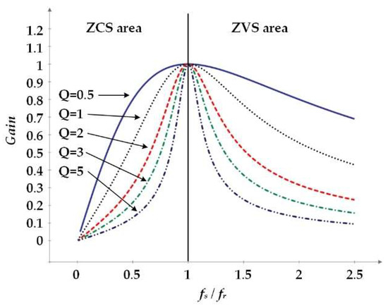 Transfer function curves of RLC series resonant converters under different quality factors.