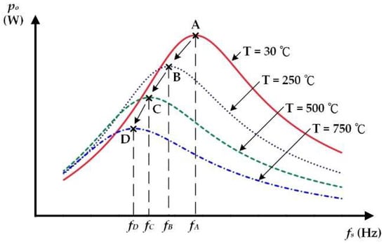 To determine the influence of the load characteristic variation on the system parameters during the heating process, this study draws the curve of the output power po corresponding to the operating frequency fs, considering the load characteristic variation. The resonant frequency fr is expressed in Formula (24). As shown in Figure 14, when the induction heating system is heating the load with the fixed input voltage, the equivalent inductance Leq and equivalent resistance Req increase with higher temperature. When the temperature rises, the equivalent inductance Leq increases, which causes the resonant frequency to decrease, and the resonant point gradually shifts to the left (low-frequency direction). Meanwhile, the equivalent resistance Req increases the same as the equivalent Leq. This decreases the loop current, resulting in a drop in the output power. Summarizing, the frequency−power curve drawn according to the change of load characteristics gradually shifts to the left (lower resonant frequency) and down (lower output power) as the heating temperature increases.