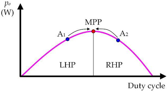 Although the system operation has the best operating frequency, this study also improves the system flexibility. The improvement of the system flexibility is realized by an adjustable duty cycle to stabilize the system’s output power and heating performance. Figure 16 is the schematic diagram of the hill-climbing algorithm, where the red dot is the MPP of po, and A1, A2 are the operating points close to the MPP. If the current operating point is A1, which falls on the left half plane (LHP), the hill-climbing algorithm [31] adjusts the duty cycle close to the MPP by comparing the two powers (previous and current). On the contrary, if the current operating point is A2, which falls on the right half plane (RHP), the duty cycle is adjusted (similar to A1) close to the MPP.